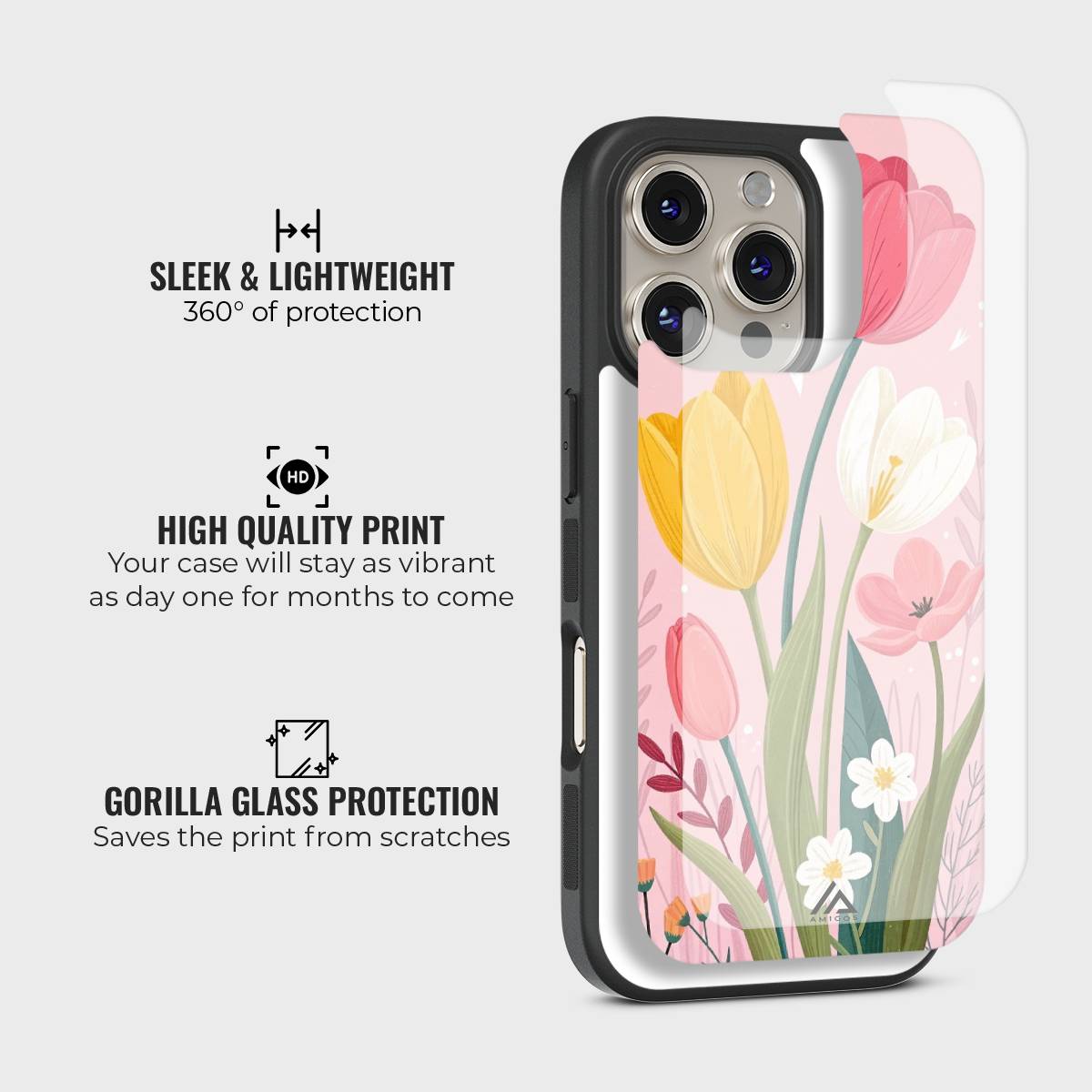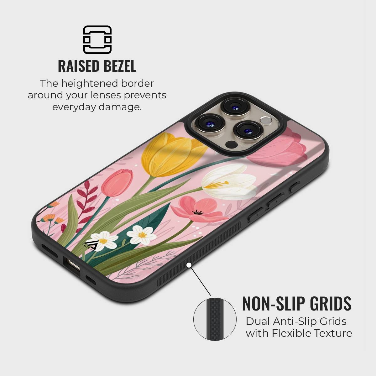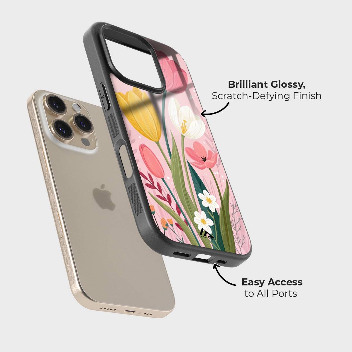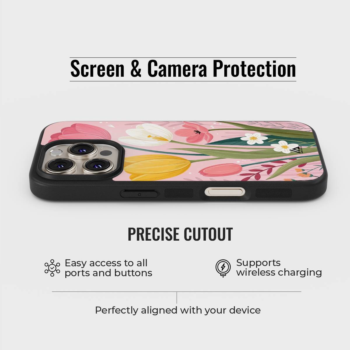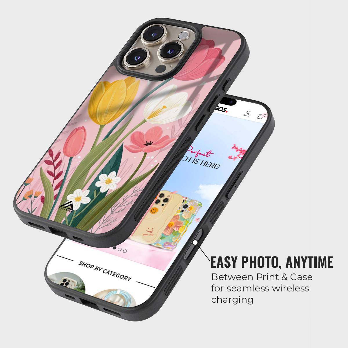 Wrapped in the coiled grace of a black serpent, Springtime Glow is more than just a phone case—it's a statement of mystique, strength, and refined danger. Set against a deep crimson backdrop with golden geometric accents, the sleek serpent symbolizes transformation, protection, and hidden wisdom.